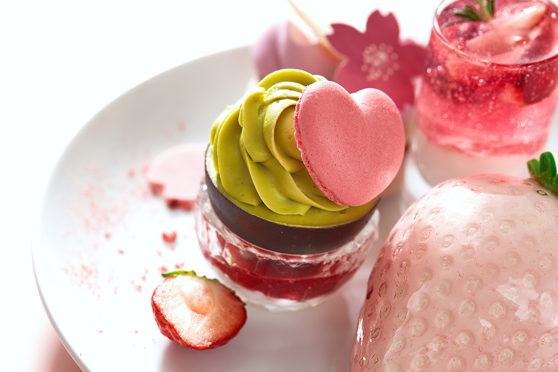 フレッシュな苺を贅沢に使用した華やかなパフェ。グラスの中には、なめらかな苺のパンナコッタやゼリーを重ね、アイスクリームは苺のショートケーキとバニラの2種類のフレーバーを添えました。