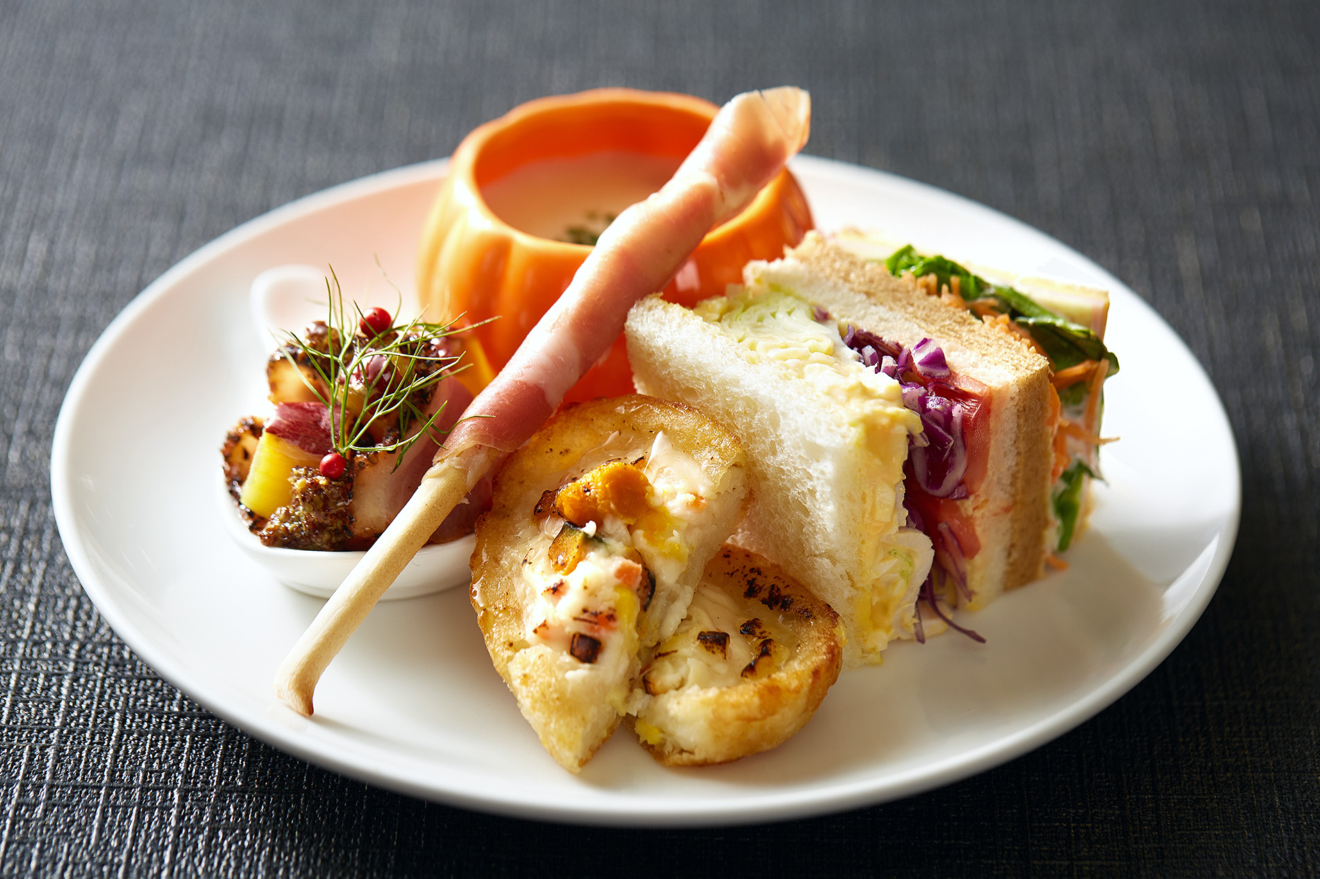 栗やかぼちゃ、さつま芋、りんごなど、秋の実りをたっぷりと盛り込んだアフタヌーンティーセット。