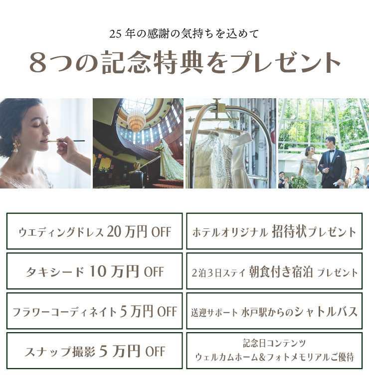 2026年に開業25周年を迎える水戸プラザホテルから、日頃の感謝の気持ちを込めて、結婚式を挙げられるカップル様・ご両家様にむけての特別なプランをご用意させていただきました。8つの特典とプラスして、より結婚式を華やかにしてくれる応援アイテムもプラスされた贅沢な内容となっております。この機会に、ぜひお気軽にご相談ください。