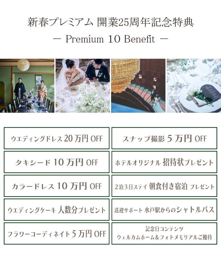 2026年のはじまりに、本年開業25周年を迎える水戸プラザホテルから、日頃の感謝の気持ちを込めて、結婚式を挙げられるカップル様・ご両家様にむけてプレミアム特典をご用意させていただきました。より華やかに結婚式を叶えるための応援アイテムを取り揃えた贅沢な内容となっております。この機会に、ぜひお気軽にご相談ください。